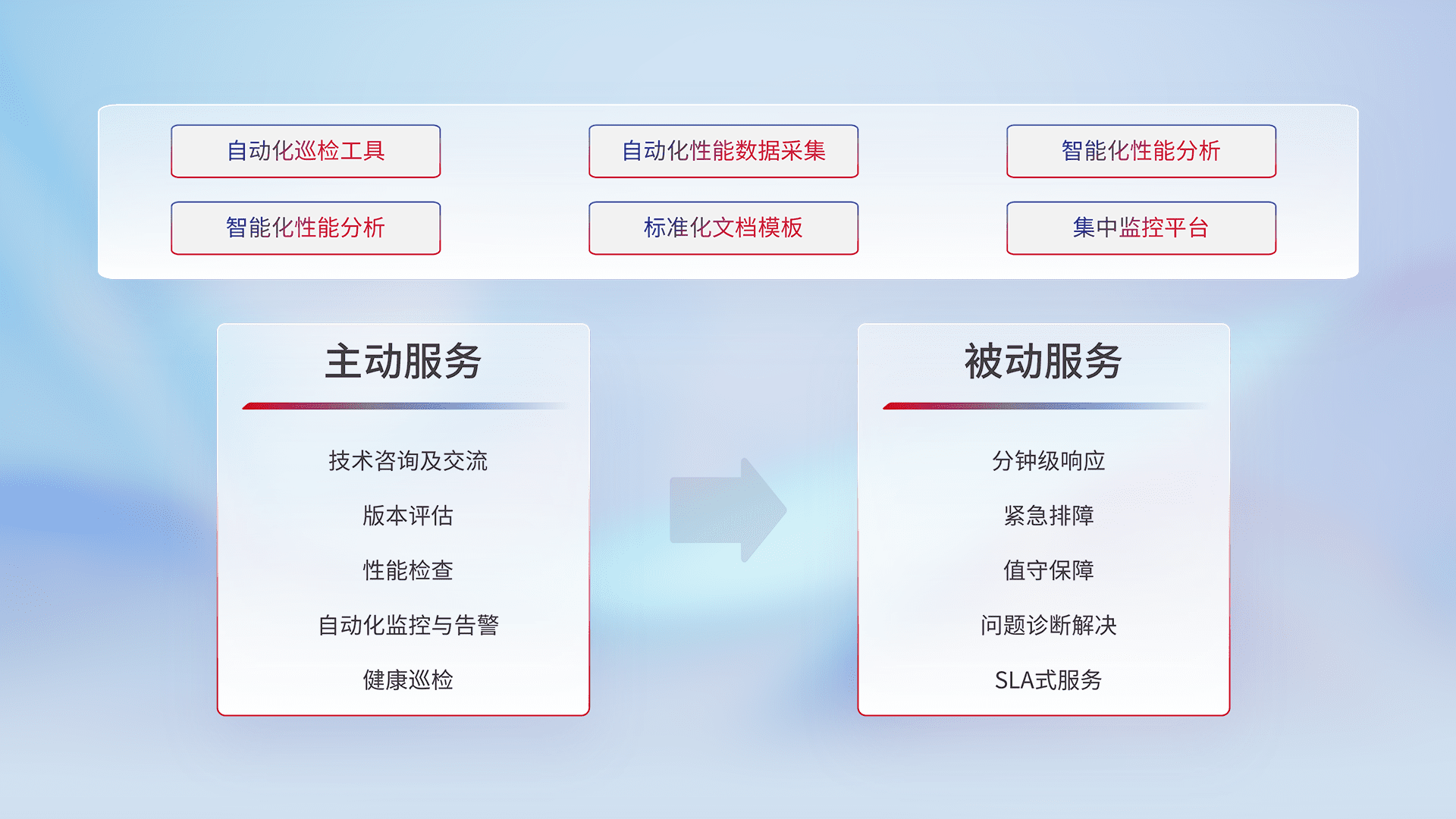 智能化工具和标准化文档,,,保障服务质量,,,提供主动服务(包含技术咨询、、、版本评估、、、性能检查、、自动化监控与告警、、、健康巡检)和被动服务包含(分钟级响应、、紧急排障、、、、值守保障、、、、问题诊断解决、、SLA服务)。。。。